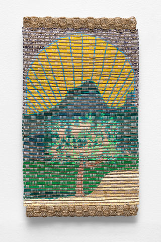 Bennett-Carpenter’s Handwoven Drawings are created through an innovative method the artist has developed that unifies drawing and weaving. In these works, she draws on the surface of soft wood, cuts the wood into thin strips, and then weaves the painted wooden slats back together on a floor loom. A new, integrated composition emerges.